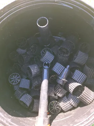 Filtro para estanque con material filtrante. - Material filtrante tipo K1. - Bomba de agua para estanque.