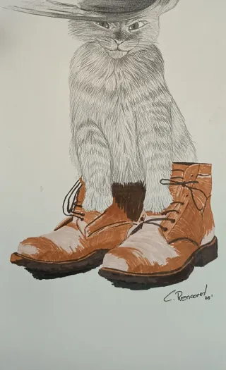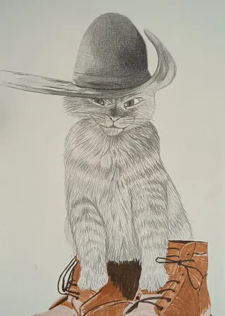 Dibujo gato con botas en técnicas mixtas