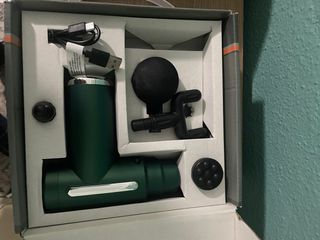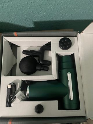 Pistola de masaje en color verde, ideal para la recuperación muscular. Incluye varios cabezales para diferentes zonas del cuerpo. - Diseño ergonómico. - Cable de carga USB incluido. - Varios cabezales intercambiables.