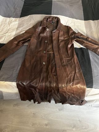 Abrigo largo de cuero en muy buen estado, talla L, para mujer de 1’80m aproximadamente. Me costo 400€ en su momento.