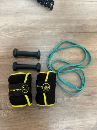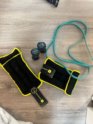 Conjunto de accesorios para entrenamiento en casa. - Dos mancuernas de color gris. - Dos tobilleras/muñequeras de color negro con detalles amarillos, cada una de 1kg. - Una banda elástica de color verde.