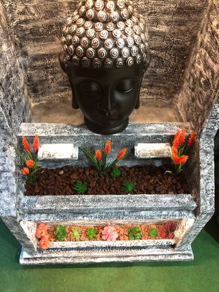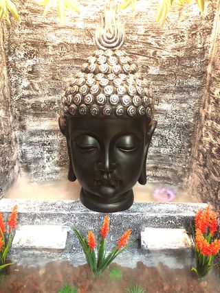 -Fuente decorativa con figura de Buda, ideal para crear un ambiente de paz y relajación. Diferente a lo visto en Gardens, etc -Agua que cae en forma de lluvia al recipiente y cae por las dos salidas que va al recipiente donde está la bomba de agua. Generador de niebla. Interruptores integrados. Luz Led Ip68 dentro de canal. -Fuente a estrenar. Hecha de cemento de fibras muy duro y vasos de agua impermeabilizados.Las zonas de piedra volcánica y corteza de pino están impermeabilizados y con desagües por si se quiere poner flores naturales. Las flores incluidas son artificiales pero muy bonitas y realistas. Probada para su entrega