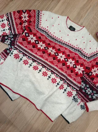 Conjunto jerseys navideños de punto con diseño de copos de nieve y grecas en rojo, blanco y azul marino. Ideales para lucir en familia durante las fiestas. Hombre talla M, mujer talla S, (tallan todos bastante grandes). Usados solo para la foto de navidad.
