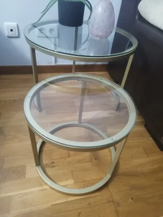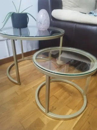 Elegante conjunto de dos mesas nido con tapa redonda de cristal templado de 5mm de grosor y estructura metálica dorada. - Diseño moderno y funcional. - Cristal templado resistente. - Estructura metálica con acabado dorado. - Medidas: 60cm diámetro x 45cm alto 40cm diámetro x 35cm alto