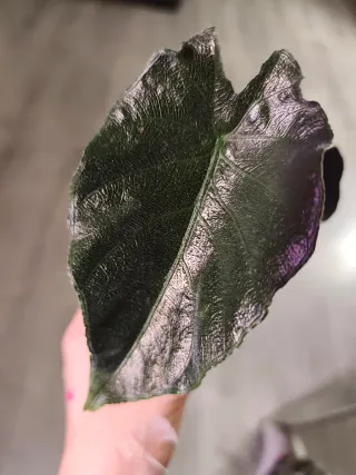 Planta de interior Alocasia Infernalis x Antoro. Hoja grande y oscura con textura. - Hoja de gran tamaño. - Color verde muy oscuro. - Textura rugosa y marcada.