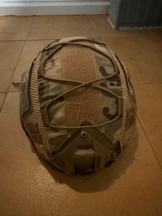 Casco táctico con diseño de camuflaje, ideal para airsoft. - Cubierta con patrón de camuflaje. - Sistema de ajuste con cordones. - Panel de velcro para parches. - Red lateral de protección. - Montura frontal para accesorios.