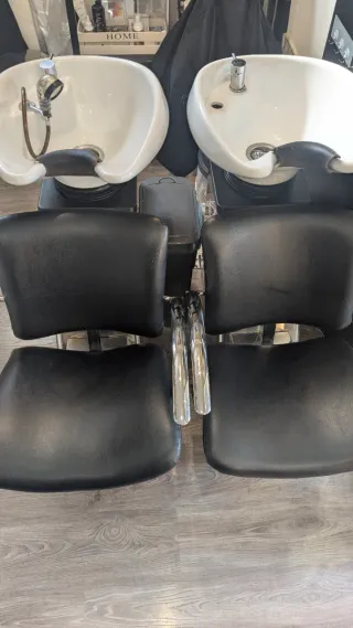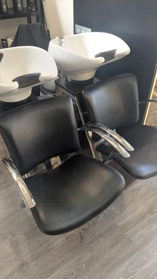 Conjunto de lavacabezas para salón de peluquería. Incluye dos unidades completas. - Diseño ergonómico para mayor comodidad. - Materiales resistentes y fáciles de limpiar. - Grifería cromada. - Cerámica Blanca. - Sillas tapizadas en negro. - Se venden juntos
