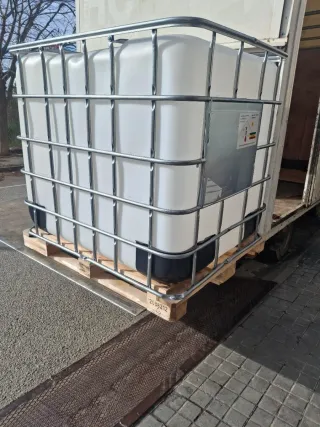 Bidón de plástico de 1000 litros con estructura metálica. - Capacidad: 1000 litros. - Material: Plástico y metal. - Válvula de desagüe.