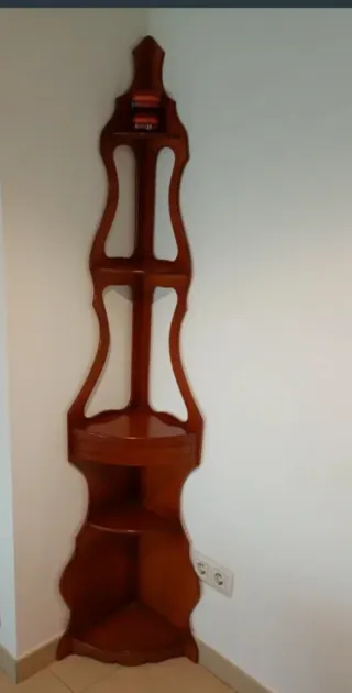 Elegante estantería de esquina de madera, perfecta para añadir un toque decorativo a cualquier rincón. - Fabricada en madera de color marrón oscuro. - Diseño de tres baldas. - Incluye dos pequeños adornos decorativos en las baldas superiores. - Un jarrón decorativo en la balda inferior.