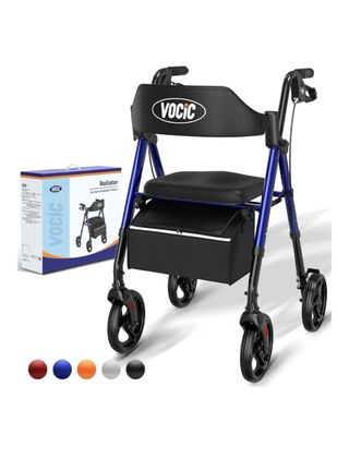Andador VOCIC azul, diseñado para ser ligero y plegable. Cuenta con asiento y cesta. - Marco de aluminio resistente. - Ruedas delanteras giratorias. - Frenos de mano. - Asiento acolchado. - Cesta de almacenamiento. - Altura ajustable.