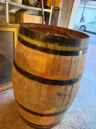 Barril de madera con un diseño rústico y llamativo, ideal para decoración. - Material: Madera. - Aros metálicos negros. - Detalles de pintura en verde y rojo. 2 Barriles los 2x100€!