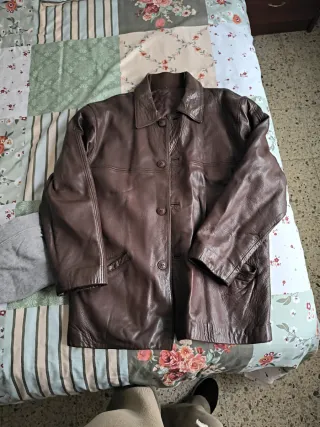 Chaqueta de cuero marrón con botones. - Cuello clásico. - Dos bolsillos delanteros. - Cierre de botones.