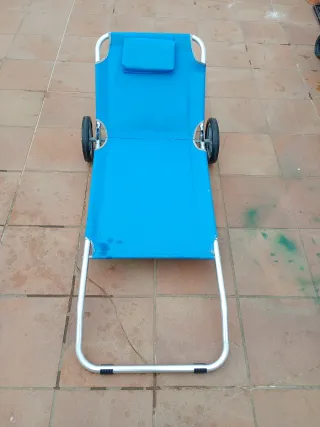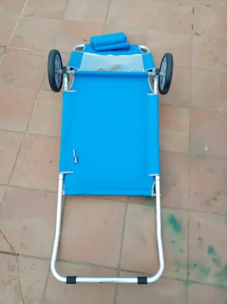 Tumbona plegable de color azul, ideal para llevar a la playa o piscina. Su diseño permite un fácil transporte gracias a sus ruedas. - Estructura de aluminio. - Cojín reposacabezas. - Tejido resistente.