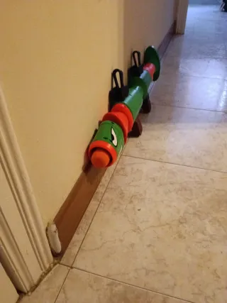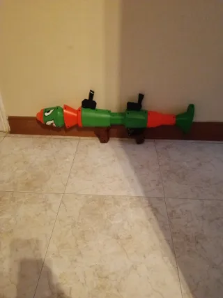 Lanzador de juguete con diseño llamativo. - Colores: verde, naranja y detalles en rojo. - Empuñadura simulada. - Dos soportes negros. - Boquilla verde en forma de cono.