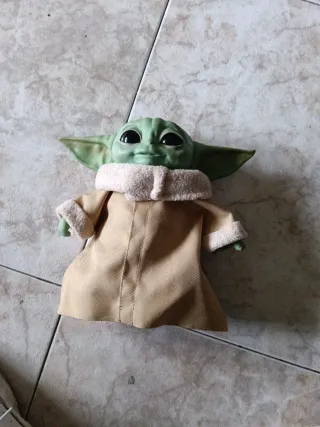 Adorable muñeco del personaje Bebé Yoda. - Color verde. - Vestimenta de tela color camel con cuello blanco. - Orejas grandes y expresivas.