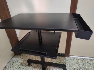 Mesa auxiliar de trabajo negra, en perfecto estado. Ideal para tatuajes o cualquier actividad que requiera una superficie de trabajo estable y con espacio adicional. - Estructura metálica resistente. - Dos niveles de superficie. - Bandeja lateral para accesorios. - Ruedas para facilitar el movimiento.