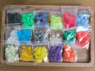Lote de broches a presión de plástico en varios colores. - Broches de plástico. - Variedad de colores: negro, verde, azul, morado, amarillo, naranja, rojo, blanco, gris, azul claro, verde claro, rosa pálido. - Ideal para manualidades y ropa.