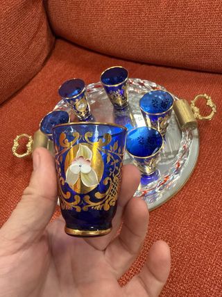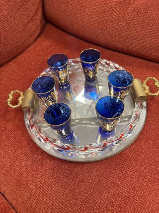 Elegante juego de seis vasos de cristal azul con detalles dorados, presentado en una bandeja metálica con asas. - Vasos de cristal azul con diseño. - Detalles dorados. - Bandeja metálica con asas.