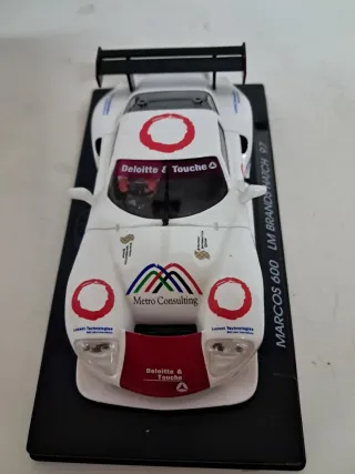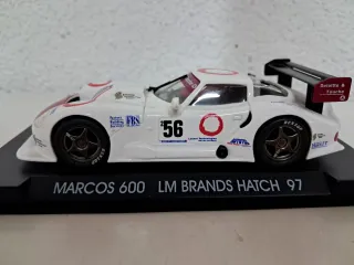 Coche de slot Marcos 600 LM Brands Hatch 97. - Réplica detallada del coche de carreras. - Decoración con patrocinadores como Dunlop, Deloitte & Touche, Lucent Technologies y Autotel. - Número de dorsal 56. Nuevo de vitrina, la urna está agrietada por la parte trasera. Fly slot car scalextric ninco scaleauto sideways carrera slot.it scx policar src nsr avant slot superslot.