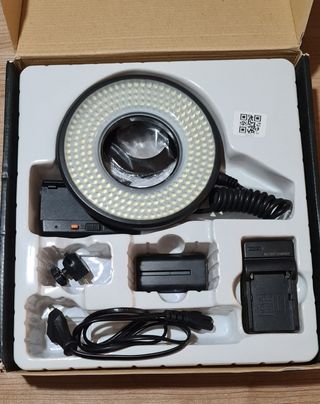 Anillo de luz LED Fotima FTL-M232, ideal para fotografía y video macro. Anillo Iluminación LED de alta luminosidad. 232 leds calibrados para fotografía o video, se alimenta de una batería NP-F550 incluye su cargador y batería. Ideal para fotografía macro, se monta en el objetivo, y para fotografía de retrato colocado en la zapata de la cámara. – incluye varios aros adaptadores para el objetivo, una Rótula de bola para poner el aro sobre la zapata de flash de la cámara. Esta nuevo nunca se a usado, me lo regalaron y lo guarde. - Incluye anillo de luz LED. - Batería recargable. - Cargador de batería. - Adaptador de montaje.