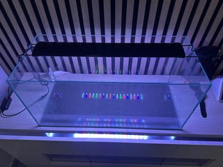 Acuario de cristal con iluminación LED incorporada. Perfecto para crear tu propio ecosistema. - Diseño moderno y elegante. - Material: Cristal resistente. - Incluye sistema de iluminación LED blanca, roja, y azul filtro y calentador 70 de largo 30 ancho, 32,5 alto