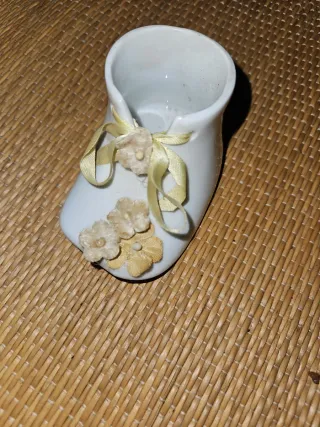 Adorable bota de cerámica blanca, perfecta como detalle decorativo. Presenta un lazo de cinta amarilla y delicadas flores de tela. - Material: Cerámica. - Adorno: Lazo de cinta y flores de tela. - Color: Blanco con detalles en amarillo. Vintage Coleccionistas
