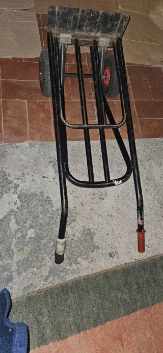 Carretilla plegable de color negro, ideal para transportar objetos. - Estructura metálica. - Ruedas para facilitar el movimiento. - Empuñaduras para un agarre cómodo.