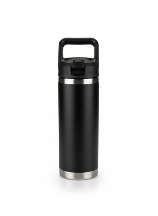 Cantimplora negra con tapa de rosca y asa. - Color: Negro - Material: Acero inoxidable - Capacidad: [Especificar capacidad si se conoce] - Diseño moderno y funcional.