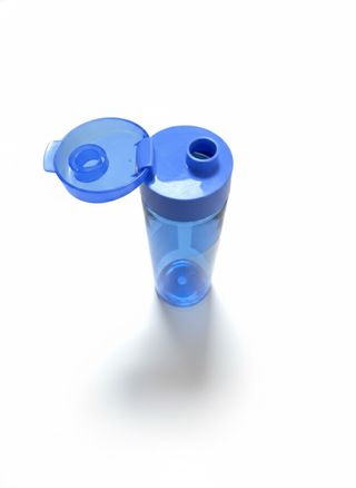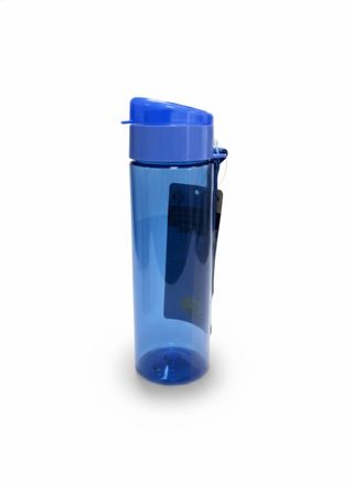 Botella de plástico reutilizable de color azul. - Tapa de rosca con cierre de seguridad. - Incluye asa para facilitar su transporte. - Diseño moderno y funcional.