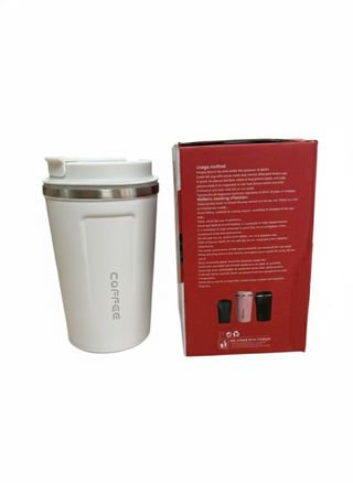 Cantimplora blanca para café, ideal para llevar tu bebida favorita contigo. Su diseño es moderno y práctico. - Color blanco. - Material: Acero inoxidable y plástico. - Tapa con cierre seguro. - Texto COFFEE grabado.