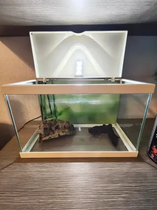 Pecera de 20 litros lista para usar. - Incluye decoración de roca y madera. - Fondo decorativo con bambú. Con filtro de mochila, calentador para peceras de hasta 40 l, termómetro , limpiacristales . Tambien regalo test para el ph, y líquido para ajustar pH, más bote de canutillos de filtración para el filtro de mochila . Incluye redecilla y aparato para limpiar (limpia fondos). Luz led , puedo incluir temporizador de pared y maquina de auto alimentación por si se va de vacaciones. - yo lo utilizaba de gambario, pero se puede de pecera guardería o Bétera , o para un cardumen de peces pequeños .