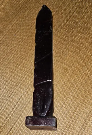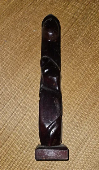 Figura decorativa de madera oscura, con un diseño tallado en espiral y una base cuadrada. - Material: Madera. - Color: Oscuro. - Diseño: Tallado en espiral. - Base: Cuadrada.