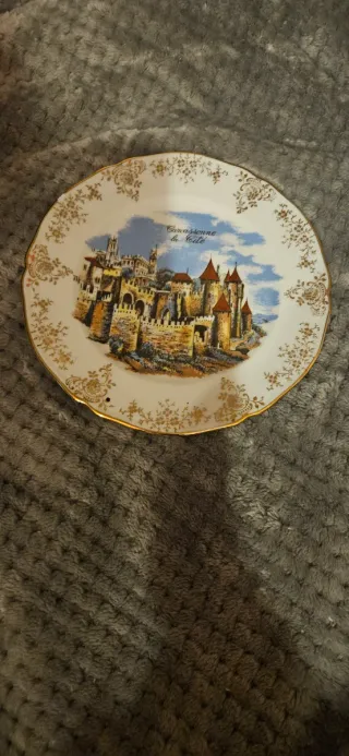 Plato decorativo con escena de Rocamadour y borde dorado. - Diseño detallado de la localidad. - Borde con motivos florales dorados. - Acabado brillante.