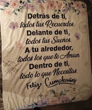 Manta personalizada para desear un Feliz Cumpleaños. Hecha de poliéster fleece (forro polar) que aisla, da calidez y ligereza y de secado rápido. El mensaje escrito: “Detrás de ti, todos tus Recuerdos. Delante de ti, todos tus Sueños. A tu alrededor, todos los que te Aman. Dentro de ti, todo lo que Necesitas”. Fondo blanco y letras en negro, acompañados de diseño floral en tonos pastel y los deseos de “Happy Birthday, Anniversary, Congratulations” en dorado vintage. Nueva, por estrenar. Medidas 154x127 cm. Lavable a máquina.
