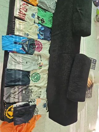 Lote variado de prendas de vestir, incluyendo camisetas y pantalones. - Camisetas con estampados de marcas como Franklin & Marshall y Superdry. - Diseño gráfico en algunas de las camisetas. - sudaderas