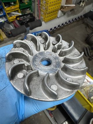 Polea para variador en buen estado tal como esta en las fotos. moto Honda Scoopy 100. - Pieza metálica. - Diseño con aletas. - Grabado GWS y 4 en la superficie.