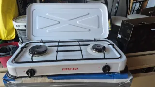 Cocina de gas portátil de la marca Super-Ego. Ideal para camping o actividades al aire libre. - Diseño compacto y ligero. - Encendido manual. - Dos quemadores.