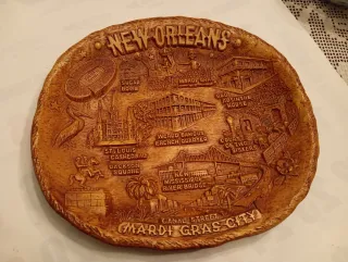 Plato decorativo de madera con relieves de lugares emblemáticos de Nueva Orleans. - Representaciones de: New Orleans, Sugar Bowl, Mardi Gras, St. Louis Cathedral, Jackson Square, World Famous French Quarter, Old Absinthe House, Court of Two Sisters, New Mississippi River Bridge, Canal Street, Mardi Gras City. - Detalle de un pelícano y un jinete a caballo. - Borde texturizado.