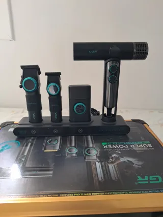 Se puede entregar en barcelona Este es un combo profesional de barbero VGR 4 en 1. - Incluye cortapelos, recortadora, perfiladora y secador. - Estación de carga. - Diseño moderno en negro y azul.