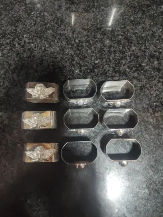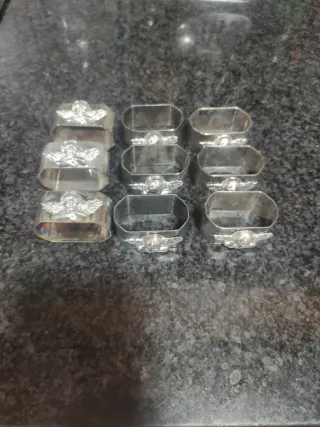 Conjunto de nueve servilleteros con un diseño de ángel. - Material: Metal plateado. - Diseño: Cada servilletero presenta un detalle de ángel en relieve. - Forma: Rectangular.