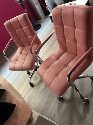 Se venden dos sillas de oficina en color rosa, con un diseño moderno y funcional. - Tapicería acolchada. - Base giratoria con ruedas. - Brazos cromados.