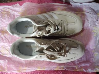 Zapatillas Adidas Samba en color beige. Un clásico atemporal con un diseño icónico. - Parte superior de cuero y gamuza. - Tres rayas características de Adidas en blanco. - Suela de goma. - Cierre con cordones. -Talle 37