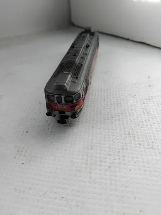 Locomotora en escala H0, ideal para maquetas de trenes. - Diseño detallado. - Color gris y naranja.