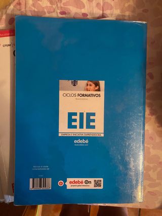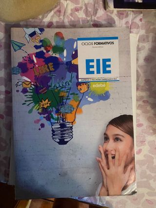 Libro de texto para ciclos formativos. - Título: Empresa e Iniciativa Emprendedora (EIE). - Cubierta con diseño de bombilla y elementos creativos. - Incluye imagen de una joven sonriente.