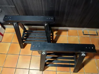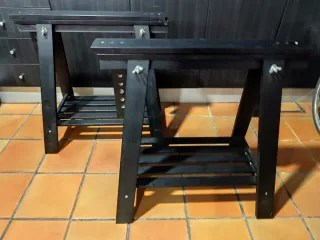 Par de caballetes negros, ideales para tu taller o espacio de trabajo. Son regulables en altura para adaptarse a tus necesidades. - Estructura de madera. - Incluye tornillería para montaje.