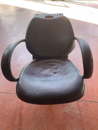 Silla de peluquería en color negro, con un diseño ergonómico y adaptable. - Asiento y respaldo acolchados para mayor comodidad. - Reposabrazos integrados. - Base estable y giratoria.