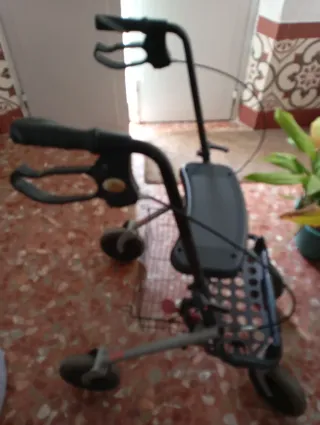 Andador Dyone 1.0 en color negro, diseñado para facilitar la movilidad. - Asiento integrado para descansar. - Cesta inferior para transportar objetos. - Empuñaduras ergonómicas. - Ruedas para desplazamiento.