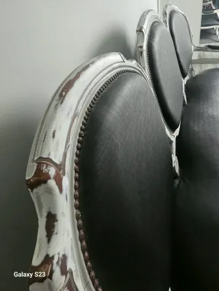 Sofá de estilo clásico con un acabado restaurado que le da un toque envejecido. - media :175 cms - Tapicería en color gris oscuro. - Estructura de madera con detalles ornamentales. - Diseño de tres plazas.