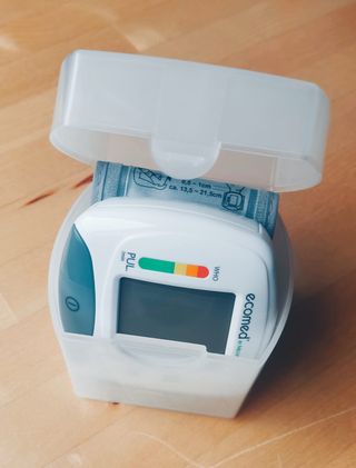 Tensiómetro de muñeca de la marca Ecomed. Nuevo, sin uso. - Pantalla digital. - Indicador WHO. - Incluye estuche. - Funciona con dos pilas AAA