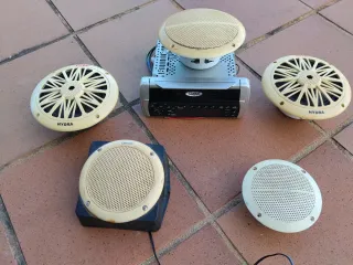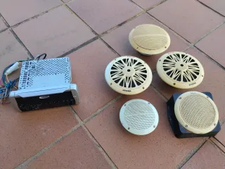 Lote de equipo de audio para embarcación. Funcionaban perfectamente cuando los desmonté de la lancha. Los tenía en un barco fueraborda, pero también sirven para intraborda o ponorelos en una piscina ya que son de exterior. Son altavoces acuáticos resistente al agua. El frente de la radio es estanco, es una Clarion marine MXD1. - Unidad principal Clarion MXD1. - Cinco altavoces marinos.